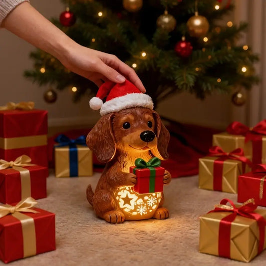 🌟Dachshund Starry Night Light—Holiday Resin Dog with Santa Hat & Gift Box