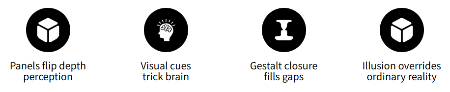Illusory Corners are illusion-based wall installations that make space behave... strangely. As you move, a floating object appears to twist and shift in impossible ways â revealing the hidden mechanics of perception itself.